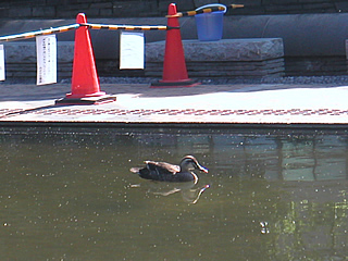 区役所の腕章を巻いた警備員がうろうろしていたので,区が警備員を派遣しているようだ。 先日の写真に写っている通行止めのコーンは,向こう側の池とこちら側の池を「横断」するためらしい。 教育の森公園のカルガモ親子 カルガモでよいようだ。 最初は,親2羽 子8羽。だが,今は違うらしい。そのための巣箱と警備員,なのか。 |