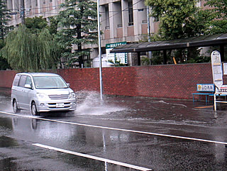 家を出ると大雨。バス停につく頃には止む。駅につくと晴れ。そんな天気。バス停のあたりは、周囲より低地になっているせいで、水が溜まりやすいのだが、今日の雨は短時間で猛烈に降ったせいか、排水が追いつかず、ものすごい量の水が溜まっていた。写真はバス停の前。歩道の上まで水がかぶっていて、車もあわてて徐行するといったところ。 最近思わぬところで浸水被害があるが、とても他人事ではない。 |