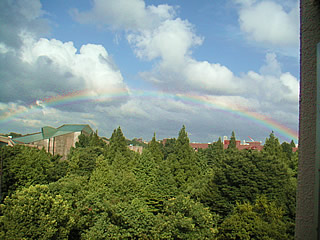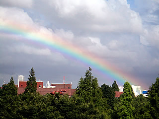 ![]() ![]() 珍しく西へ進む台風のせいで、コマギレの雨雲が気まぐれに通る。 雨。どしゃぶり。なのに日が差す。 「虹が出ているんじゃないか」との声に、6階の窓から外をのぞけば、そこに虹。 その虹を「自分のものにしようとしてカメラ向けた」ら、成功しました。 |