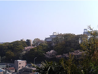 野毛山の裏手から、母校を見遣る。すでに散り始め。 大岡川