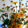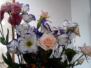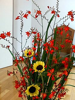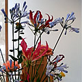 水色:アガパンサス(紫君子蘭) 赤色:グロリオサ(百合車) だと思う。お花屋さんで買ってきて、礼拝前に生けられる。買ってこられた方も名前を知って買うわけではない。 写真から、花の名を特定するのは容易ではないが、そこはネットのチカラ。 |