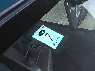 車検から引き取ってすぐ翌日に、新しい車検証とステッカー(検査標章)が送られてきた。 なかなか張り替えられずに、今日ようやく張り替えた。 車検前(再掲) 保安基準適合標章 車検後新しいステッカーは、なんだか不思議。 台紙には、上下2枚貼りついている。上側が大きめで透明+数字が印字されている。下側が一回り小さく水色で地紋しかない。 まず、下側の台紙を真ん中で折り、はがれた上半分を上のシールに合わせるように貼る。すると上下2枚があわさって1枚のステッカーになる。上側の台紙をはがして、ガラスに貼る。外から見ると、ちゃんと水色の枠に数字が書いてある。というもの。(この説明で分かるだろうか?) |