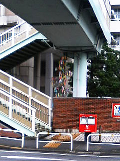 歩道橋の向こうに、七夕飾りが小さく見える。塀のむこうは、小学部の校舎なのだろう。