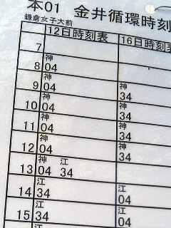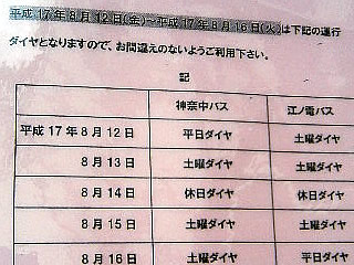 今年のお盆は、いつが休みなのだかはっきりしない。ギョーカイは15日月曜を休みにするらしいが、ウチの会社は15日月曜〜19日金曜を休みとした。すでに東京駅などは夏休みモードだし、高速道路も帰省ラッシュは12日〜16日あたりがピークらしい。 写真はバス停に掲げてあったお知らせ。神奈中は 15・16が閑散と予想し土曜ダイヤ。江ノ電は12・15を土曜ダイヤ。こんなまちまちでは乗るほうはたまったものではない。午前中神奈中・午後江ノ電という共管路線があるのだが、その時刻表がごらんのとおり。やれやれ。 |