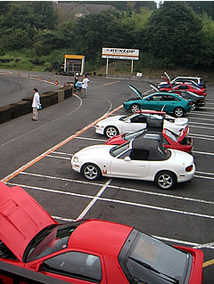 我らがD−Tribe(といってもただの友達連中なのだが)が主催する初めての走行会。メンバー7人(=7台)のほかに、ゲストも多数参加してくださり、総勢15台程度になりそうだ。 港南台IC発のAチーム4台は、インターそばのコンビニに5:00AM集合。4台連なって横横を北上するも、ETCで先んじていた間に1台見えなくなり、横浜町田ICから3台で西行き。左ルートから合流してすぐの足柄SAに6:10分すぎ着。ここを全体の集合場所とする。脱落した1台は保土ヶ谷バイパスへ入る前に誤って首都高へ行ってしまったとのこと。間に合えばよいが。ほどなくBチーム(三ツ沢発)も、それから今日の参加者も数台あつまる。 ここから連なって、富士IC〜西富士道路〜一般道で給油しつつ〜 富士宮白糸サーキット着が8時前ごろ。 全面アスファルトで、とてもタープのペグを打てそうにない。が、天気は曇り。まだ暑さも感じないという程度。みな荷物を下ろすのに手一杯で、参加費を集金し(今回私は会計係!)、ドラミ(ドライバーズミーティング)をはじめられたのが8時半と予定から30分遅れ。コース管理者側からは特に言われなかったが、ヘルメット・長袖・長ズボン・グローブは必須とする。また、走行中は少なくとも運転席側の窓を閉めるなどを遵守する。 その後、慣熟歩行(といって、コースを一周歩くのだ)。コースのところどころが、ショートカットできるように繋がっているのだが、初めて走行するときにはどこがコースだか分かりにくい。そこで、コースの要所要所にカラーコーンを立てるべく、Z氏のクルマに積んで一周。歩くと乗るとでは大違いということをまず初めに実感する。 午前中から走行したのが13台。午後から2台増えて15台。 2〜3台ずつ5グループに分けて、10分間の走行をする。1周約1分弱なので、10周程度できる計算になる。 コースの初めと終わりに、旗持ち係として交代で立つ。コース終端側はタイムを計測し、10分立ったらチェッカーフラグを振る。 午前中は2巡出来た。最初は、シートポジションがなっていなくて、とてもカラダを保持できない。それから、どんな走り方がよいのか全く分からず、高速でコーナーに突っ込んでは、タイヤをキーキー鳴らせて曲がっていく。昼前から日が差してきて、日焼けしそうなほど。車内も暑く、とても10分も走っていられず、途中でやめてしまうクルマも出るほど。午後は1巡8分にすることにした。 バーベキューの昼食。さすがに日が差してきて日陰が恋しく、使っていないタイヤを重ねてポールを立ててタープを張る。 午後から計測機を借りることが出来た。オレンジ色のタバコ大くらいの機械をクルマに貼り付ける。私のクルマでは、ドアの内側下で十分計測できたが、そうでない車もあり、確認のため数周走ることとなった。タイムはホームストレート先の電光掲示板に表示される。コントロールラインを通過してから表示されるので、見られるのは一瞬ではある。タイムを計ってみると、速さの違いが明らかになる。最も早い人で40秒ほどで回ってくる。自分が走ってみると52秒台。早い人を見ていると、動きがスムーズで滑らかなことが良く分かる。高速でコーナーに突っ込んだりブレーキを急に踏んだりするのが早い走りだと観念的に思っていたのだが、そうではないことに思い当たる。 ということで午後2巡目。D塾長に言われたとおりに、まずはブレーキをちゃんと残してみる。それで回ってみると、50秒台が出た!。次の周回では、タイヤが鳴らないような走りを心がける。それで50秒台。なかなかいいぞ。では、カーブをていねいに回るようにして…と回って、ホームストレートに入ったところ、表示板に「49.941」の数字が出た!。50秒を切ったぞ!。というところで、チェッカーフラッグが出て、この巡はおしまい。早く走るということはそういうことか。早い速度でカーブに入るのではなく、カーブを曲がれるスピードを維持していくということが、全体として早くなるということに納得をする。 では次はそれをもっと実践してみよう。 などと思って、旗振り役として座っていると、「Guroのクルマから、オイルが漏れてるよ」と呼ばれた。見てみると、ありゃりゃ、クルマの下から黒い液体が流れ出している。どうもエンジンのしたあたりからオイルが漏れているようだ。上からのぞくと、奥から漏れでたオイルがピチョンピチョンと跳ねて落ちているのが分かる。オイルゲージを見てみたら、すでにカラに近い状態。もちろんこのまま走るのは無理だが、はたして帰ることが出来るのかどうか。D塾長が下からのぞいて見てくれたが、分かりにくい場所であること。むむう。少なくともオイルは足さなければ危険。帰り道にオイルを買って入れて帰るか、それとも今買ってくるか。参加者のmさんが、「いま行ってきましょうか」とクルマを出してくれることを買って出てくださり、ありがたく同乗する。ふもとのオートバックスまで約7キロ。来たときはそうは思わなかったが、