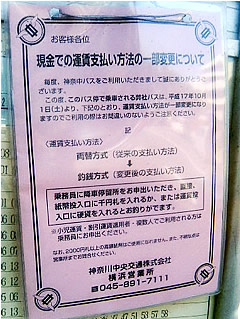バスの料金支払方法には、両替方式と釣銭方式とがある。お釣りが必要な際に、まず両替してから入れるか、入れたらお釣りが出てくるか、の違いであるが、どちらか知らずに乗る場合には戸惑うことが多い。この地区の神奈中バスは、長らく「両替方式」だったのだが、10月1日から「釣銭方式」に変わったとのこと。ま、バスカードで乗る分には関係ないんだけれど。 神奈中がいまだに「両替方式」を続けていたのは、これはバスカードを導入した際の料金箱(機械)が、釣銭方式に対応していなかったからであろう。その後で料金箱を新しくした江ノ電バスが「釣銭方式」だったので、来るバスによって方法が異なっていたのだが、ようやく統一されたということになろう。 3月末に新料金箱に変えた(それも1日で一斉に!)ばかりだが、方法を改めるのに半年かけたのはなぜか。機械の習熟に時間をかけたということだが、両替方式では乗客が料金箱に続けて投入してもよかったので、釣銭方式に変えてから1人ずつ区切って料金を入れてもらうルールを徹底させる必要が出てきてしまった。 ところで、この地区のバスだが、今まで方向幕だった車両も後付交換でLEDに変わりつつある。「昔は、行先の文字が幕に書いてあって、それをグルグル回して表示を変えていたのだ」と、説明に窮する日がもう間近い。 |