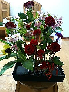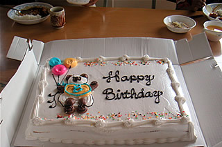 9月最初の日曜日。聖餐式。役員会は省略。午後から「教会一日研修会」として、ほんの1時間だけ学ぶ時間をもつ。この教会だけだと思うが、宗教的な事項についてなにか教えられるという時間は、年に1回たったの1時間だけなのである。ってことは去年も書いたな。今年は、バプテスト派の歴史について。日本基督教団(戦時中の圧力により各宗派が合同して発足)とのかかわり。バプテスト連盟という団体(大きい団体:信者約数万人程度)と、バプテスト同盟という団体(比較的小さい団体:名簿上信者数2千人程度)について。宗派論になるとちょっとややこしい。が、まあ、いたしかたない。当教会は、その小さいほう、バプテスト同盟に所属している教会であるということ。 ところで、この日は、牧師先生のお孫さん家族(3家族、孫7人)がお集まりになった。牧師先生をはじめ8月・9月生まれが5人もいるということで、大お誕生日会となった。写真はコストコ製の巨大バースデーケーキ。写真のおくに見えているのがカレー皿である。横幅は1メーターを越えるであろう。32等分しても5センチ角ぐらい。。。むむむ。バタークリームべったりで、なかなか食べられなかった。