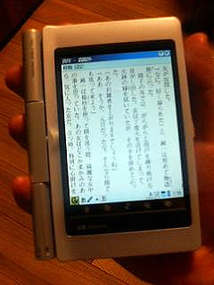 結局、昭和の本は開かずじまい。PCで読むことができるのなら…と考え、TP君から長期貸与中(?)の ZAURUS の ブンコビューア で読んでみた。意外に「電子ブック」なるものの初体験になった。電車の中でもまあまあ読める。難点は 1)角度によっては反射する 2)電池維持のためにはバックライトを10秒でoff設定にするが、読んでいるとoffになっちゃってうざい。というところか。利点としては、1)ジョグダイヤルが(生意気にも!?)ついているので片手でページが繰れる=電車で立って読むのに最適! 2)文庫1冊よりは軽いかも。2冊よりは確実に軽い。 この小説の感想も少し書いておこうか。文中にフランス語の単語(文章も)が多く出てきて意味が取れない部分が多かった。辞書を引いてまで読もうとは思わず。 |