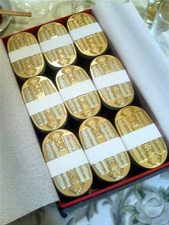 夜。友人S氏の新居(といっても1年以上も経ってしまっているのだが)にて、D−Tribeの新年会。集まった友人T氏がお土産に持ってきたのが、なんとその名も「山吹色のお菓子」。その名のとおり「おぬしもわるよのう」ごっこが出来るというもの。