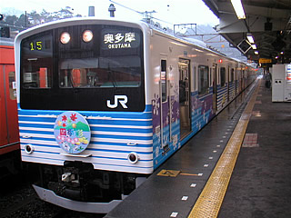 教会のご婦人がたに誘われて、奥多摩の酒蔵見学へ行ってきた。 戸塚10:13→湘南新宿ライン(1650E)→10:57新宿 新宿11:06→青梅特快(1025T)→12:05青梅 青梅12:11→1215デ→12:27沢井 青梅からは「四季彩」編成だった。南側がクロスシート。先頭車は南側を折りたたみ式の展望シートになっている。 先頭から 春:梅の花 夏:レンゲショウマ 秋:紅葉 冬:雪模様とゆず お食事 酒蔵見学の後、唎き酒で3種を飲み比べる。古酒はよい香り。沢井15:26→1506デ→15:41青梅15:44→1518T→16:55新宿17:00→湘南新宿ライン(3180Y 8分遅れ)→17:46大船 |