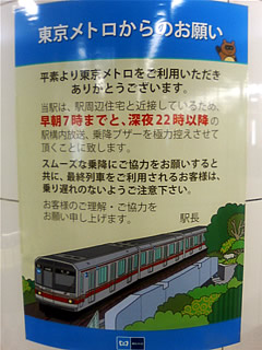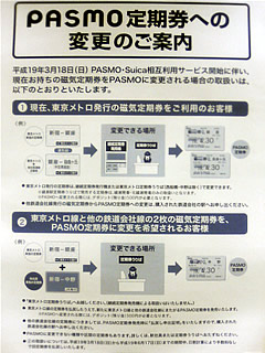 ●ならないベル 帰りに茗荷谷駅へ降りたら、なんか様子が変。ホームのベルが鳴っていない。あれ?と思ったら、柱にこんな掲示が。確かに半地下で、地上側は人家が隣接しているが、それにしても昭和30年代からこのままなのに、いまさらなんでベルをやめるのか。 JRで言えば北鎌倉駅や山手駅などは、何年も前から、ベルの使用を最小限にしているのにねえ。 茗荷谷駅のホームドアは2月上旬から使用開始でした。写真?はまたこんど。 ●ぽっかりあいた穴 東京駅で15日撮影。東京駅の改修工事がどんどん進んでいく。天井がきれいに張られたり、ホームの床石材が張り替えられたり。そんななかで、予想通り、路線図が取っ払われた。一両日中に、新しいもの――たぶん、以前と違って、線がまっすぐで、字が小さくなってしまうのだろう――が新設されるのだろう。 そんなことを予想して撮っておいた以前の写真はこちら ●PASMO 写真を撮って残しておくべきはこちらか。PASMO切替の案内。メトロオンリーの定期券はそのままPASMOに変えてくれる。また、すでに1枚になっている接続定期券も、そのままPASMOに変えてくれる。 でも、JRを含む他社線と2枚の定期券は、新たに接続定期券のPASMOを買いなおすことになる。その場合の払い戻し手数料は向こう3ヶ月間に限り無手数料とするそうだ。変えてもらった窓口の会社の分はその場で払い戻しで、接続先の他社線の分は「払い戻し証明」をもらってその会社の窓口へ行く。 でも払い戻しは「日割り計算」なのでもったいない。いま持っている定期が切れるまで、そのままガマンするのがよろし。 生涯最後の磁気定期券はいつまで手許にあるだろうか。 |