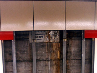 ![]() 昨日撮ったのは、東京駅池袋行側の路線図撤去跡だったが、反対側つまり新宿行側を見てみると、古い駅名表と古い路線図の一部が見えていた。 昔はコンクリート打ちはなしの上にじかに貼り付けたのだろう。それがそのまま化粧壁の向こうに封印されている。 |