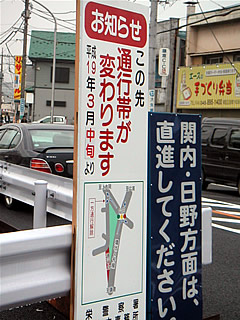 県道原宿六浦線と鎌倉街道とが重なっている区間。公田交差点〜桂町交差点〜鎌倉女子大交差点なのだが、拡幅工事がいよいよ終盤にさしかかっている。天神橋商店街のアーケードもすべて取り払われて、歩道が再整備される。 そんななか、桂町方面から鎌倉街道方面へ左折する一方通行の細い道が、その役目を終えようとしていることがわかった。 路肩の看板には「3月中旬」とあるが、まだ走れるようで、名残を惜しんで写真におさめておく。 ![]() この大きな表示板も、実は書き換えないとならない。 ![]() ![]()