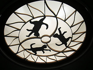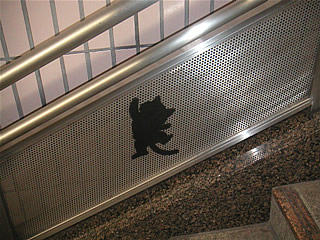 予定が目白押しの日曜日。 まずは踊場駅。 戸塚区汲沢の一角は、踊場と言われた地域。夜な夜な猫が踊りを踊っていたという話から名がついたらしい。いまは地下鉄の踊場駅があるが、駅のそこかしこに、猫が踊って(!?)いる。 ![]() 駅入り口の上にも。/階段の踊場の天井にも。 階段の手すりにも。 ![]() ん? 猫の目!?/そういえば、入り口の外観も猫耳のような気が… 踊場駅に踊場はいくつあるでしょう。なんて問題が出たりして。 戸塚10:45→10:47踊場 |