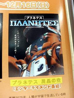 中央区築地というか、明石町に「タイムドーム明石」というプラネタリウムがある。 旧友、K氏・e氏(最近飲むのもご無沙汰です)、N氏とy氏と久しぶりに集まる。 プラネタリウム上映用に編集された、アニメ「プラネテス」を鑑賞。いい話だ。というか、アニメをプラネタリウムで見るというのも面白い。ついでに(で申し訳ないが)プラネタリウムというのも何年ぶりだろうか。 新橋駅前で旧交をあたためる。 六本木15:02→15:15築地 |